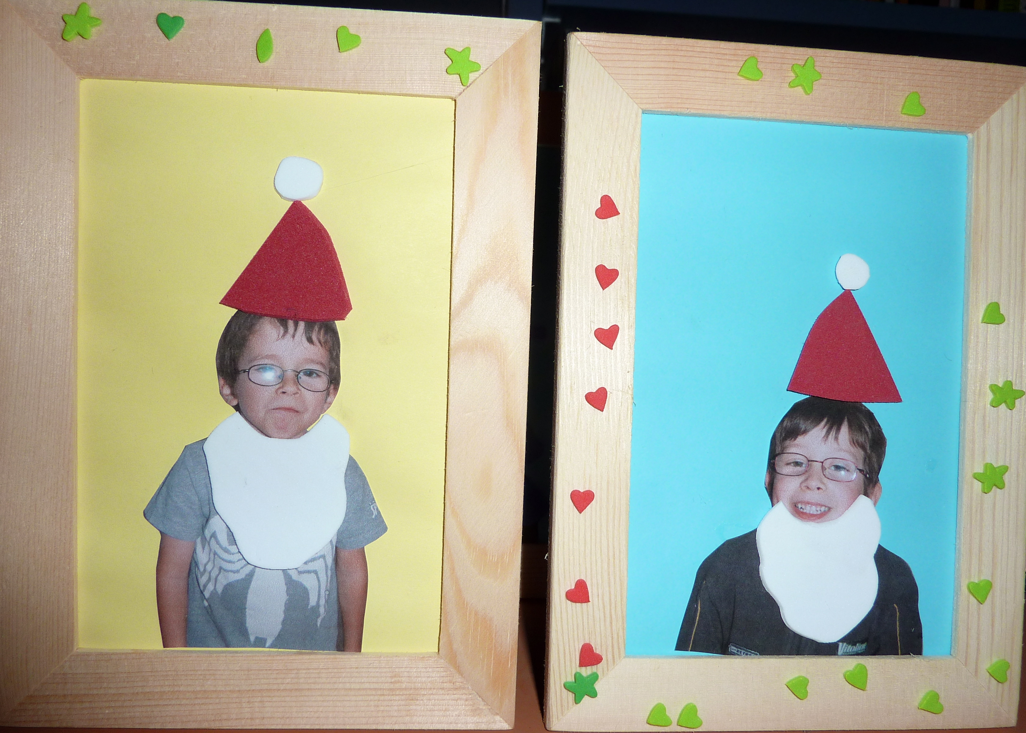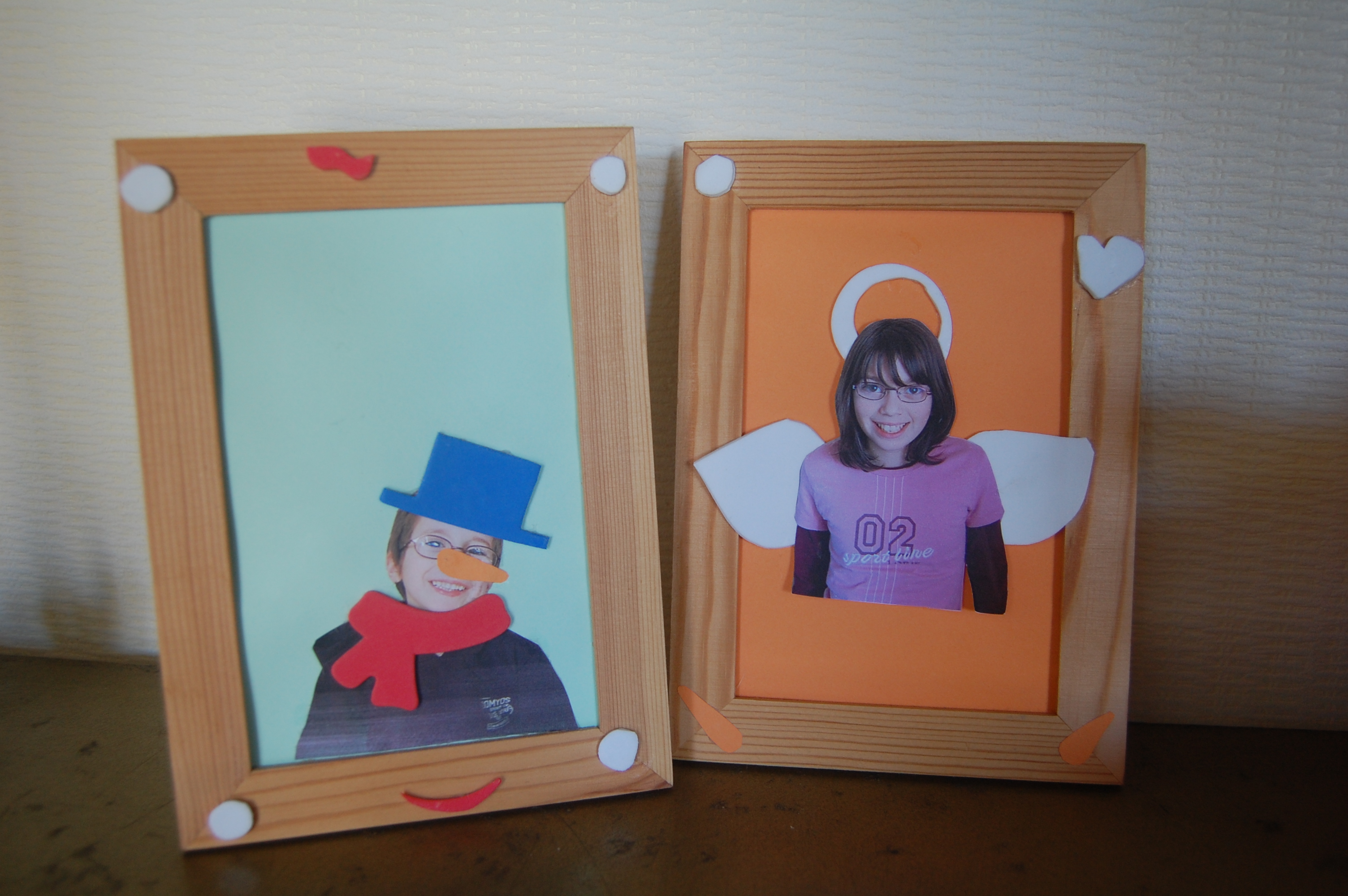 Pour ce bricolage, j’avais acheté des petits cadres bon marché et retiré les verres. Les enfants devaient choisir le papier de fond, découper et coller leur photo, et se « déguiser ». Trois choix : père noël, bonhomme de neige ou ange. J’avais découpé à l’avance dans du papier mousse les chapeaux, écharpes, carottes, bonnets rouge, barbes blanches, ailes et auréoles…