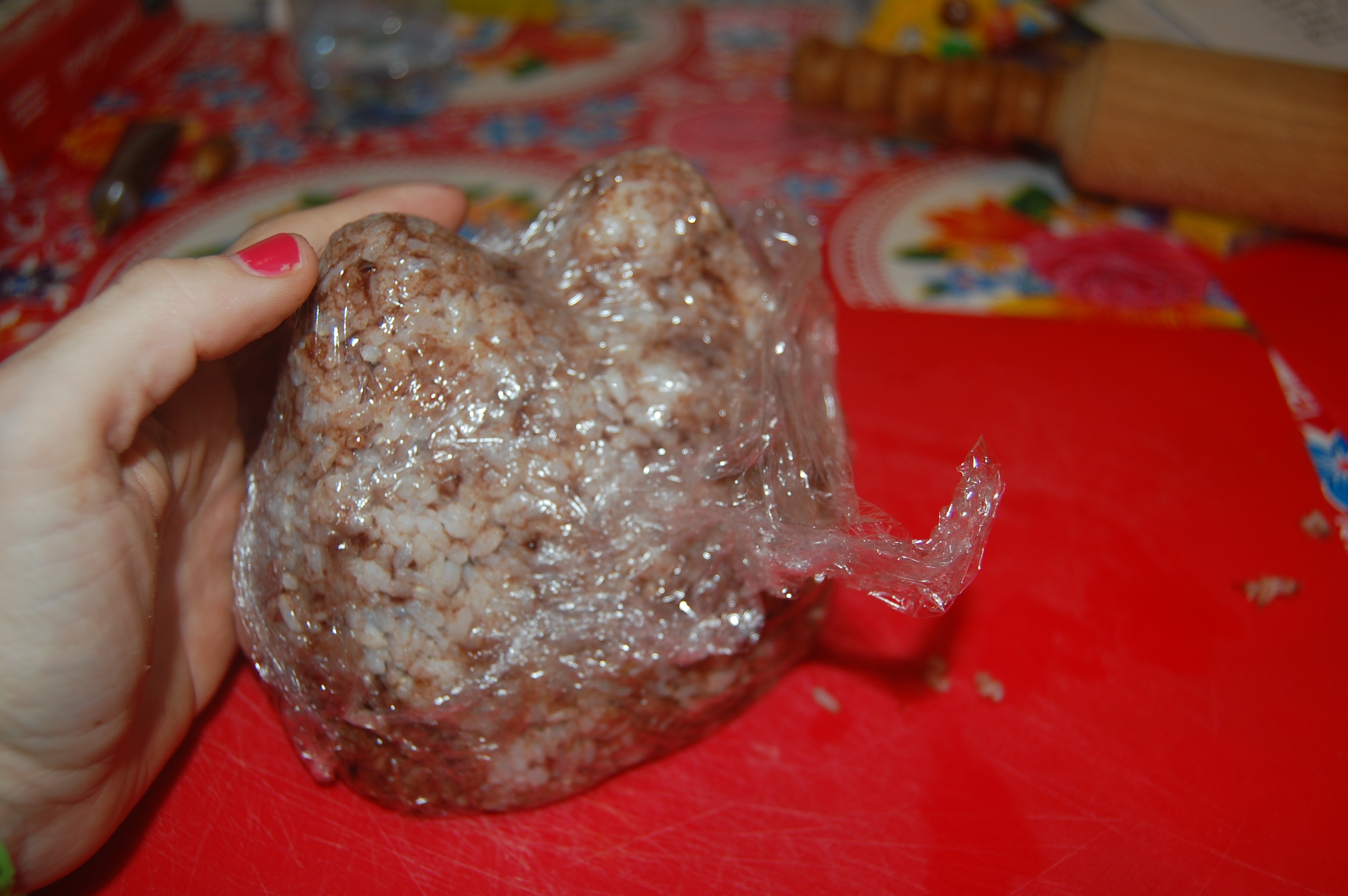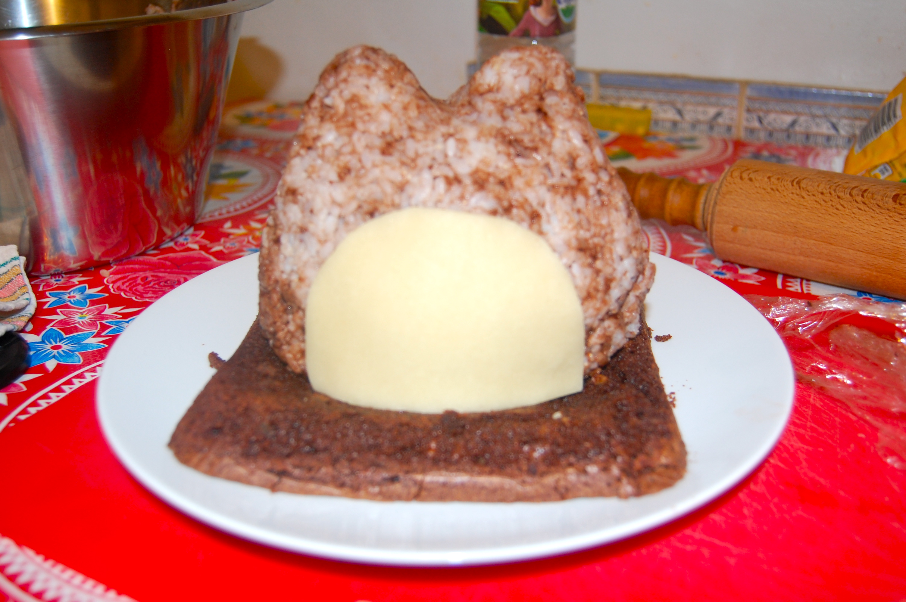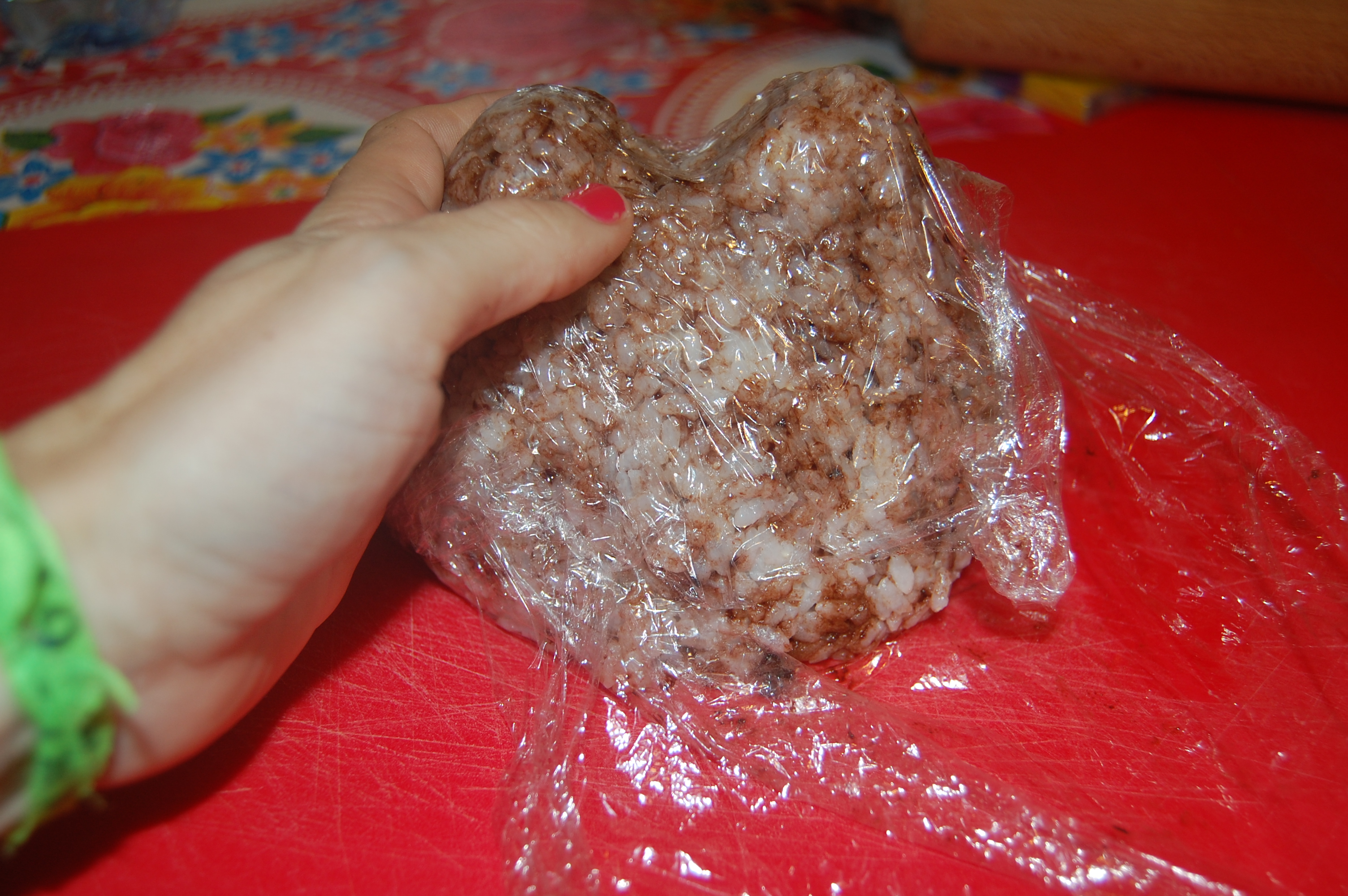 Pour commencer, on fait cuire du riz rond, comme indiqué sur la boîte… puis on le laisse refroidir 15 minutes environ. Puis on le mélange avec des vermicelles de chocolat. Pour faire le moulage, on utilise du film transparent, qui a l’avantage de ne pas coller au riz. On peut mettre au milieu du chocolat..