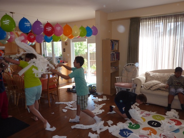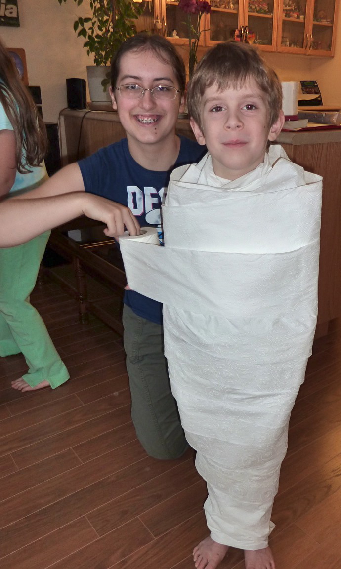 Ce jeu vient de l’enfance de Christine, et on l’utilise souvent pour les anniversaires des enfants : on fait des équipes de 2, chaque équipe reçoit un rouleau de papier toilette.