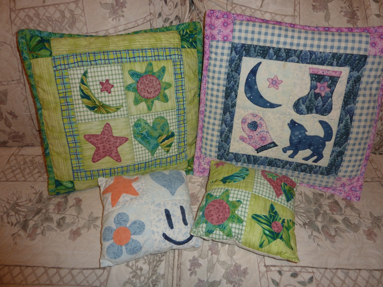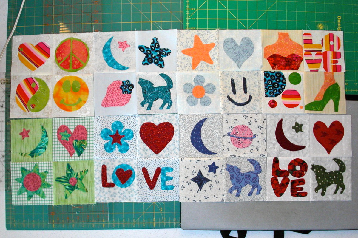 Pour la petite histoire, je suis une passionnée de patchwork, autrement appelé courtepointe ou quilting au Canada. Alors pour les 12 ans de Nadège, j’ai vu grand. J’avais trouvé dans un magazine de quilting un super patron pour faire des coussins avec des appliqués. Comme un coussin entier, c’est pas mal grand, j’ai jugé qu’on pourrait faire des mini coussins avec comme base 4 carrés cousus les uns aux autres pour former un plus grand carré (un « 4 patch » en lingo de quilting). Ensuite, j’ai pris à la bibliothèque des livres avec des idées de motifs d’appliqués et j’ai acheté de l’adhésif thermocollant (fusible Web en anglais) pour tissus (existe en feuilles et en rouleaux). Avec ma collection de tissus pour le quilting, j’étais prête (J’ai assez de tissus pour toute ma vie, et plusieurs autres…)!