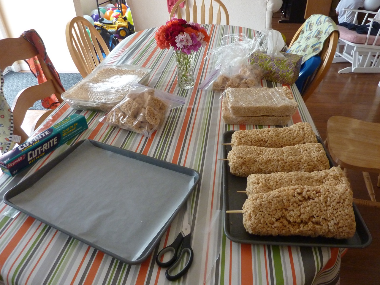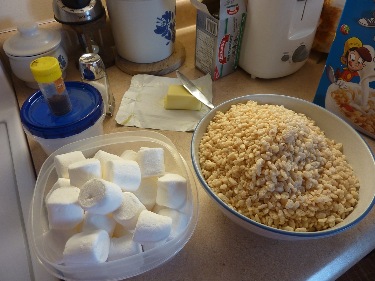 Les ingrédients : 250 g de chamalow (des guimauves au Canada); 50 g de beurre; 6 tasses de Rice Crispies; de la vanille