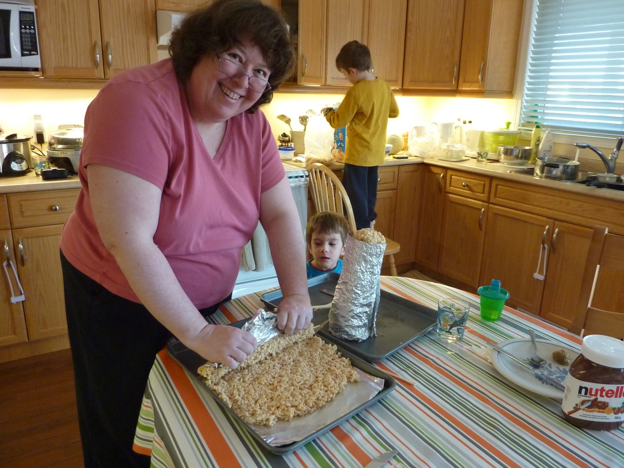 Pour les tours, j’ai beurré du papier alu. J’ai fais une couche mince, mis une baguette, puis j’ai enroulé pour faire un cylindre. Je l’ai ensuite « moulé » jusqu’à ce qu’il ait la forme désirée :