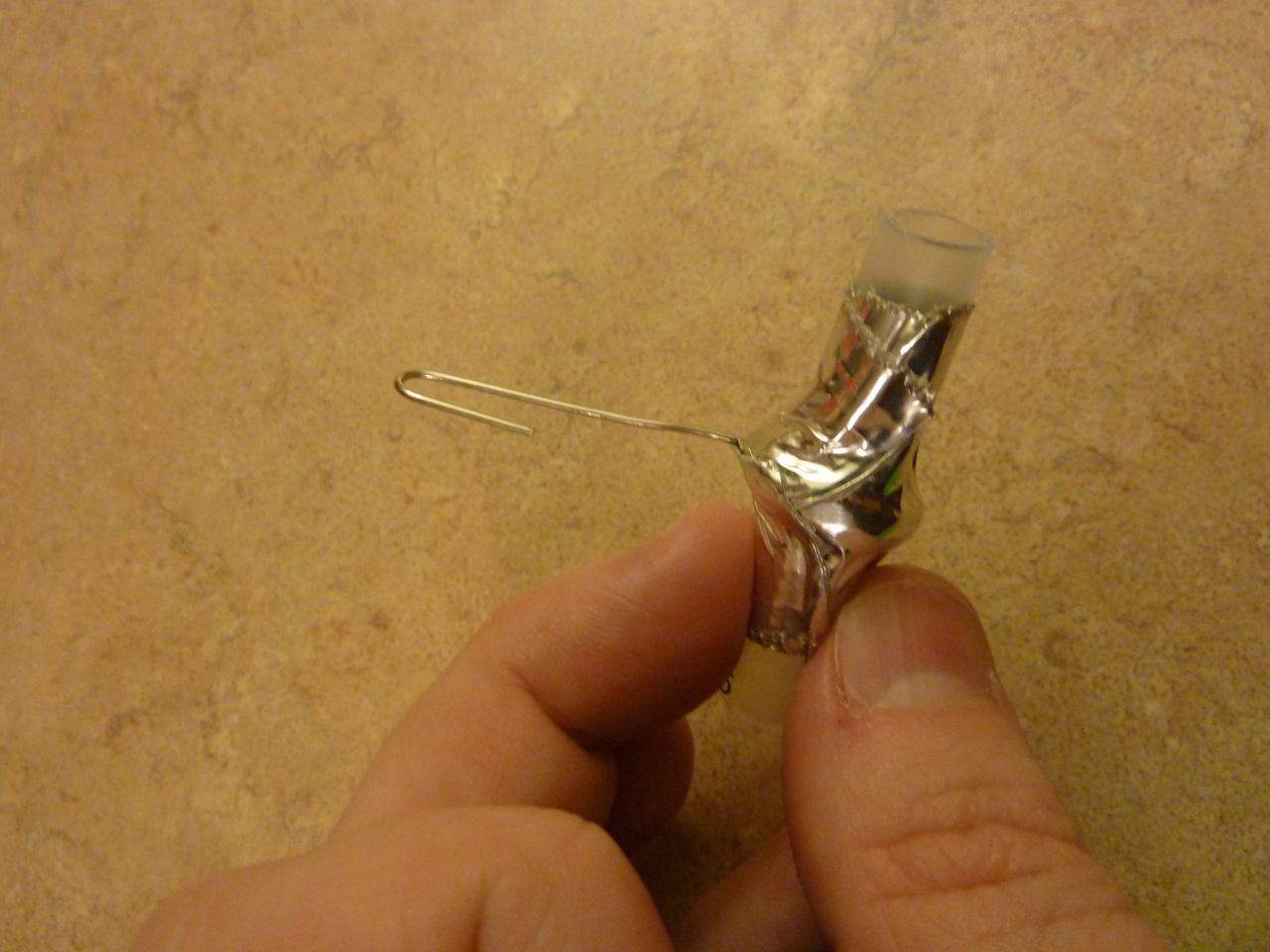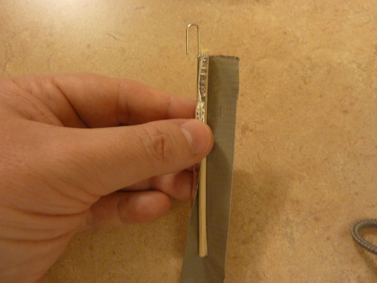 Couper un morceau de duct tape de 9cm par 1,5 cm, et scotchez le trombone à la brochette. Il faut essayer de ne pas faire de bosses ou replis, pour ne pas trop épaissir l’axe. Il doit pouvoir passer dans la gaine et y tourner sans frottement.