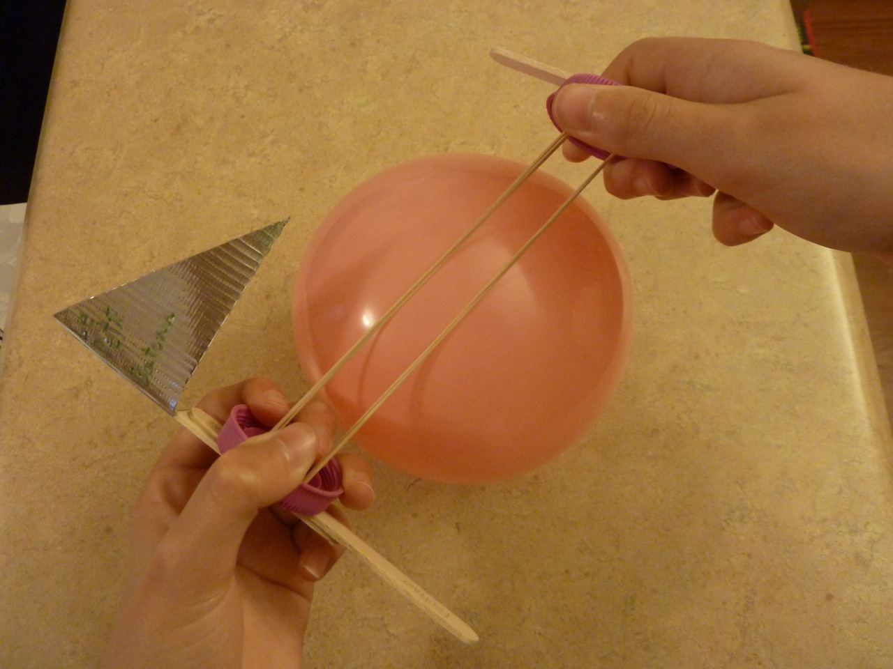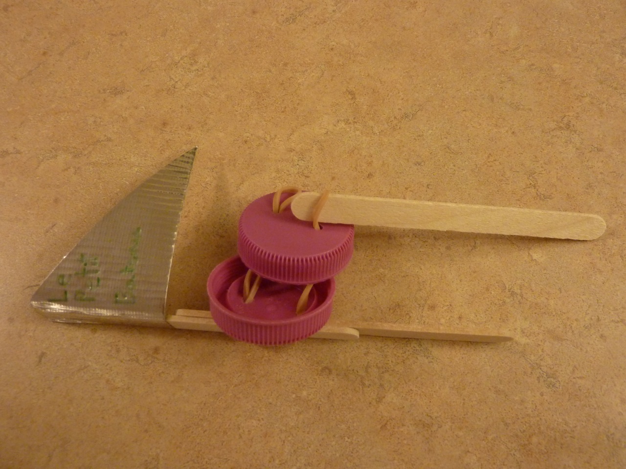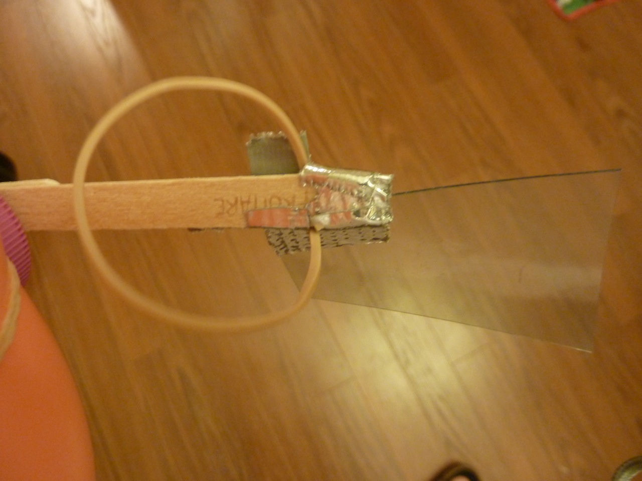 3. Sur le baton qui est à l’avant du bateau, fixez le dernier élastique avec du duct tape, puis le gouvernail.
