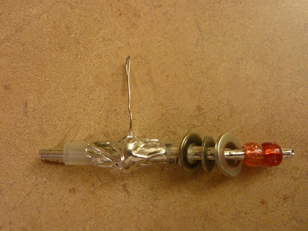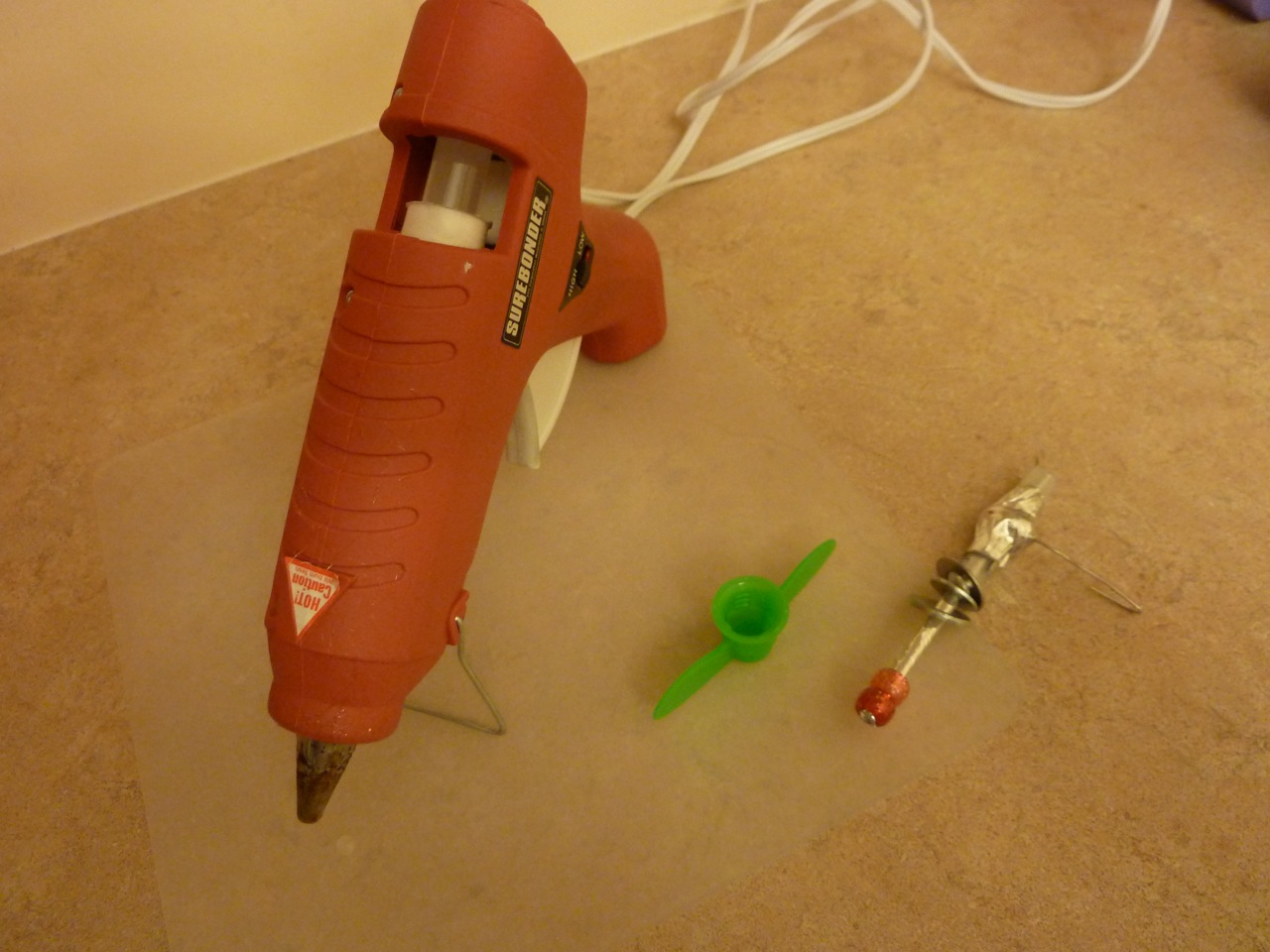 1. Sur l’axe, enfiler la gaine, 4 à 5 rondelles, et 2 perles. Celles-ci doivent être bien ajustées, et ne pas pouvoir bouger. Mettez-les bien à l’extrémité. Mettez une bonne dose de colle chaude dans le bouchon en forme d’hélice et plantez le bout de l’axe avec les 2 perles dedans. Tenez bien droit, et laissez refroidir.
