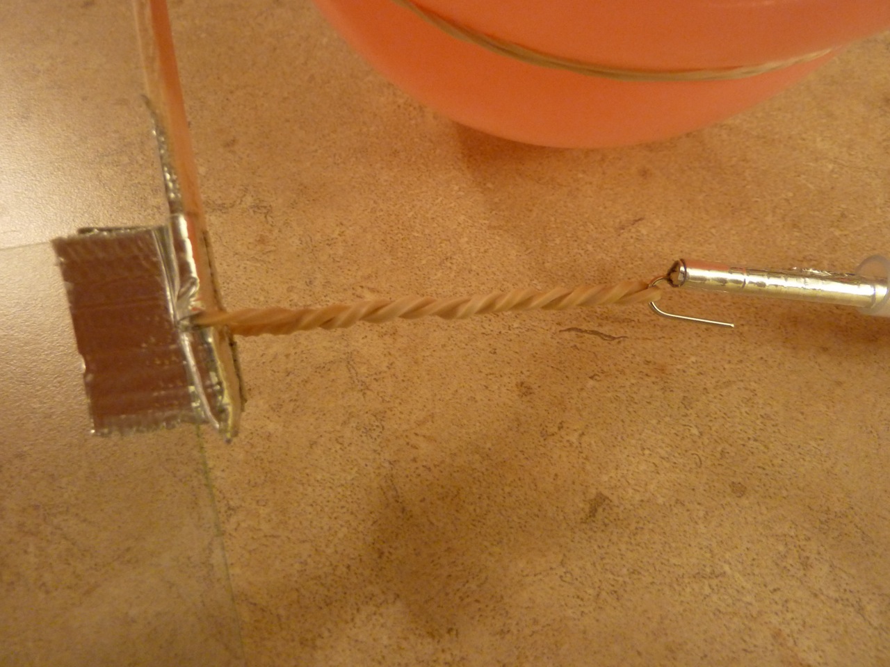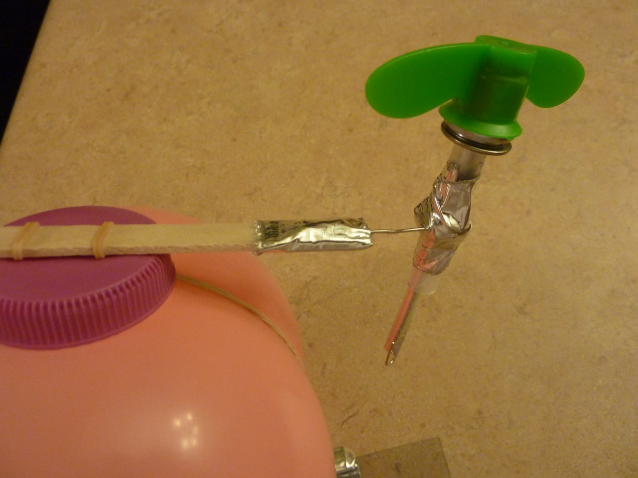 2. Collez le trombone qui part de la gaine sur baton de glace qui se trouve à l’arrière du bateau. Attention au sens. L’hélice doit être à l’arrière, et le crochet de l’axe à l’avant. Une fois collé et sec, entourez le trombone et le bâton de duct tape pour un joli fini et pour sécuriser le tout.