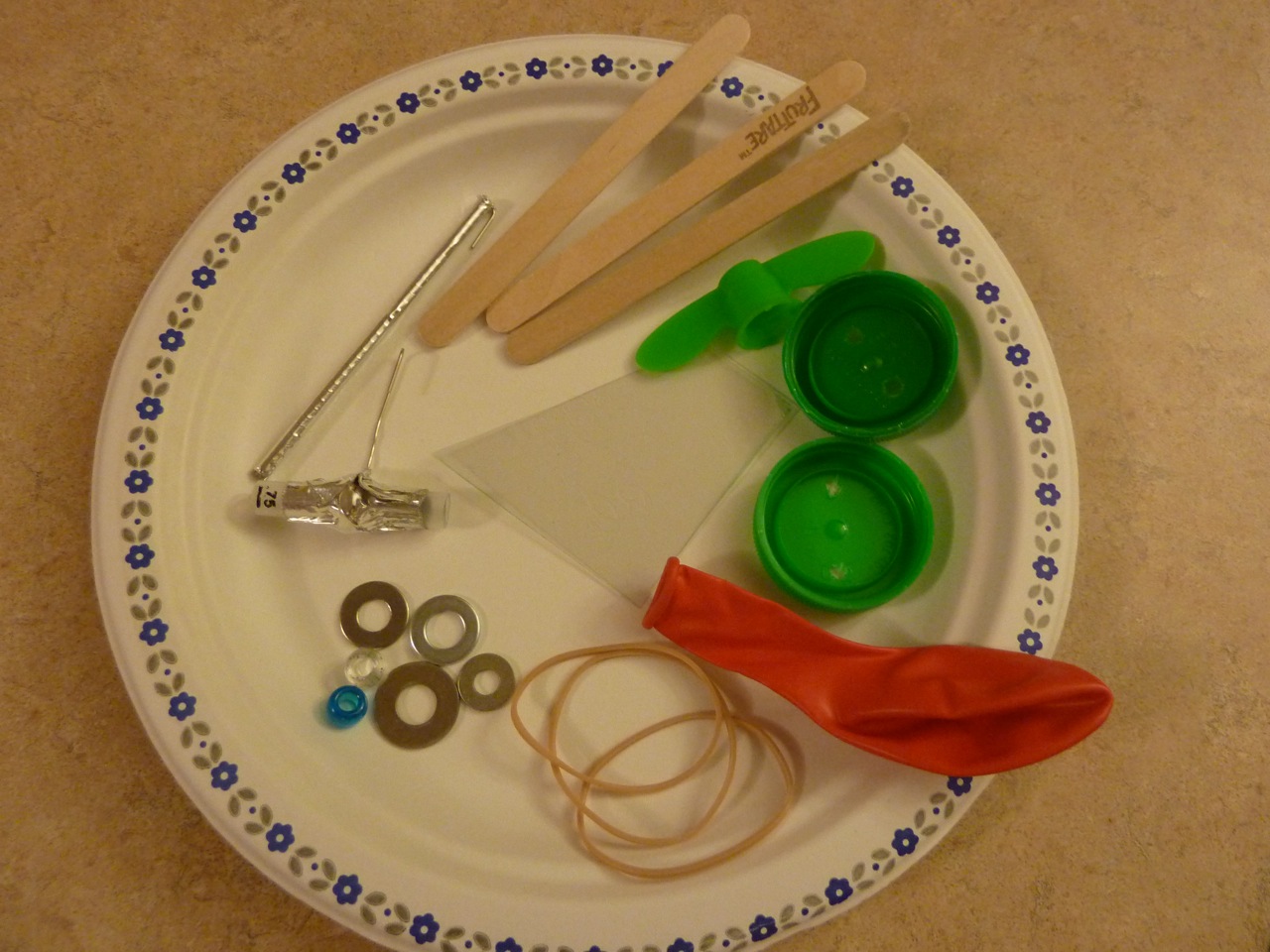 Pour les 8 ans de Michel, je voulais faire un bricolage de garçon, avec un mécanisme simple, mais propre à stimuler l’imagination de mon bricoleur. Je me suis longtemps demandé ce que je ferai, et puis un jour, mon mari à ramené des compotes en sachet individuel à la maison. Elles avaient un bouchon en forme d’hélice!!! J’ai tout de suite décidé qu’il fallait que je fasse quelque chose avec ces bouchons. J’ai un peu la folie des bouchons dernièrement… J’ai donc cherché sur Internet comment faire une hélice pour un moteur, et j’avais en tête d’y ajouter un élastique pour le faire tourner… J’ai vite réalisé que ce serait plus facile à dire qu’à faire, mais j’ai finalement trouvé des images d’avion avec ce genre d’hélice et j’ai réinventé la roue. Mon premier prototype était très compliqué, et ne marchait pas du tout. J’étais hyper déçue. Ma fille aînée m’a alors rappelé que le frottement était une force redoutable et m’a orienté vers la solution. Après réflexion, j’ai dévalisé la réserve de rondelles de mon mari, j’ai mis une goutte d’huile, et le tour était joué. J’avais une hélice tournant super vite dans l’air. Je suis donc allée tester mon bateau dans la baignoire, et j’ai connu ma seconde déception. Le bateau tournait en rond… Pas d’hélice hélas, c’est là qu’est l’os, comme je l’ai compris en me souvenant du Titanic et de son hélice imbriqué dans un gouvernail… Mais comment ajouter un gouvernail!!! Mon père m’a suggéré alors de le mettre à l’avant, ce que j’ai fait. Le résultat n’est pas encore idéal, mais c’est le mieux que j’ai pu faire, et je me suis dit que si je trouvais une solution à tous les problèmes, mes génies en herbe n’auraient plus rien à faire. Alors j’ai décidé d’en rester là, j’ai simplifié mon prototype, puis j’ai préparé mon matériel pour la fête. En testant la réalisation avec Émilie, je me suis rendue compte que la réalisation de certaines pièces étaient un peu trop complexe pour des enfants de huit ans, alors je les ai préparées à l’avance. Me voilà donc fin prête à animer le premier atelier de construction de bateaux-ballons. Souhaitez moi bonne chance!