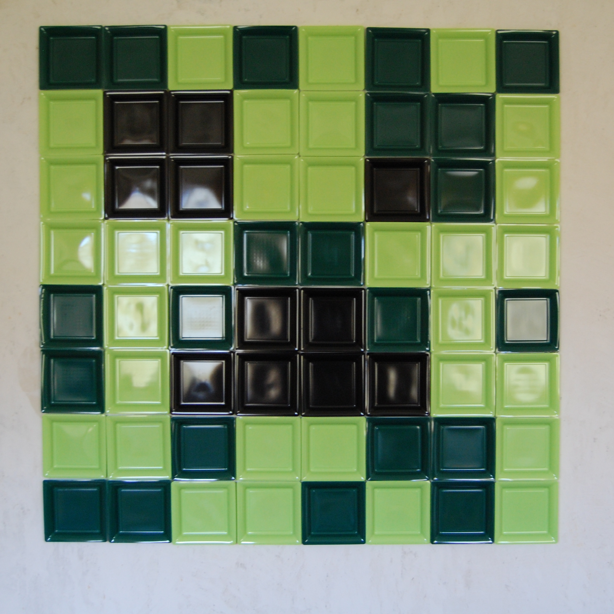 J’ai fait le creeper avec des assiettes en plastique de couleurs, trouvées à jour de fête, et collées au mur avec du scotch double face (attention, le scotch peut abîmer le mur..)