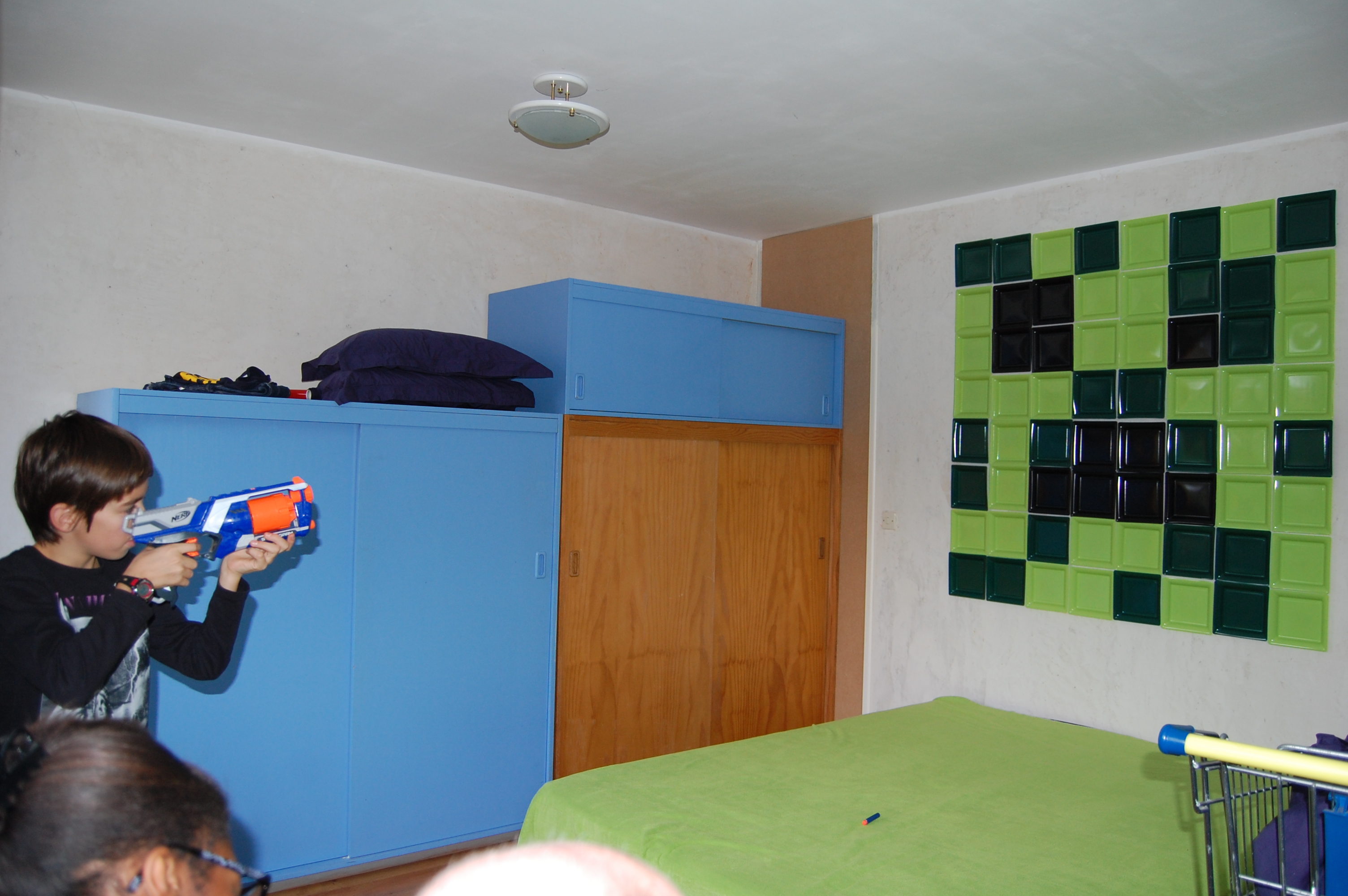 Pour les 11 ans d’Eliot et Samuel, sur le thème des jeux vidéos, il y avait 20 enfants. Comme je trouve dangereux de les laisser jouer avec des nerfs quand ils sont si nombreux, j’ai retiré toutes les balles de nerfs de la maison, et j’ai organisé dans une chambre un stand de tir creeper (tous les enfants qui jouent à minecraft connaissent les creepers..)
