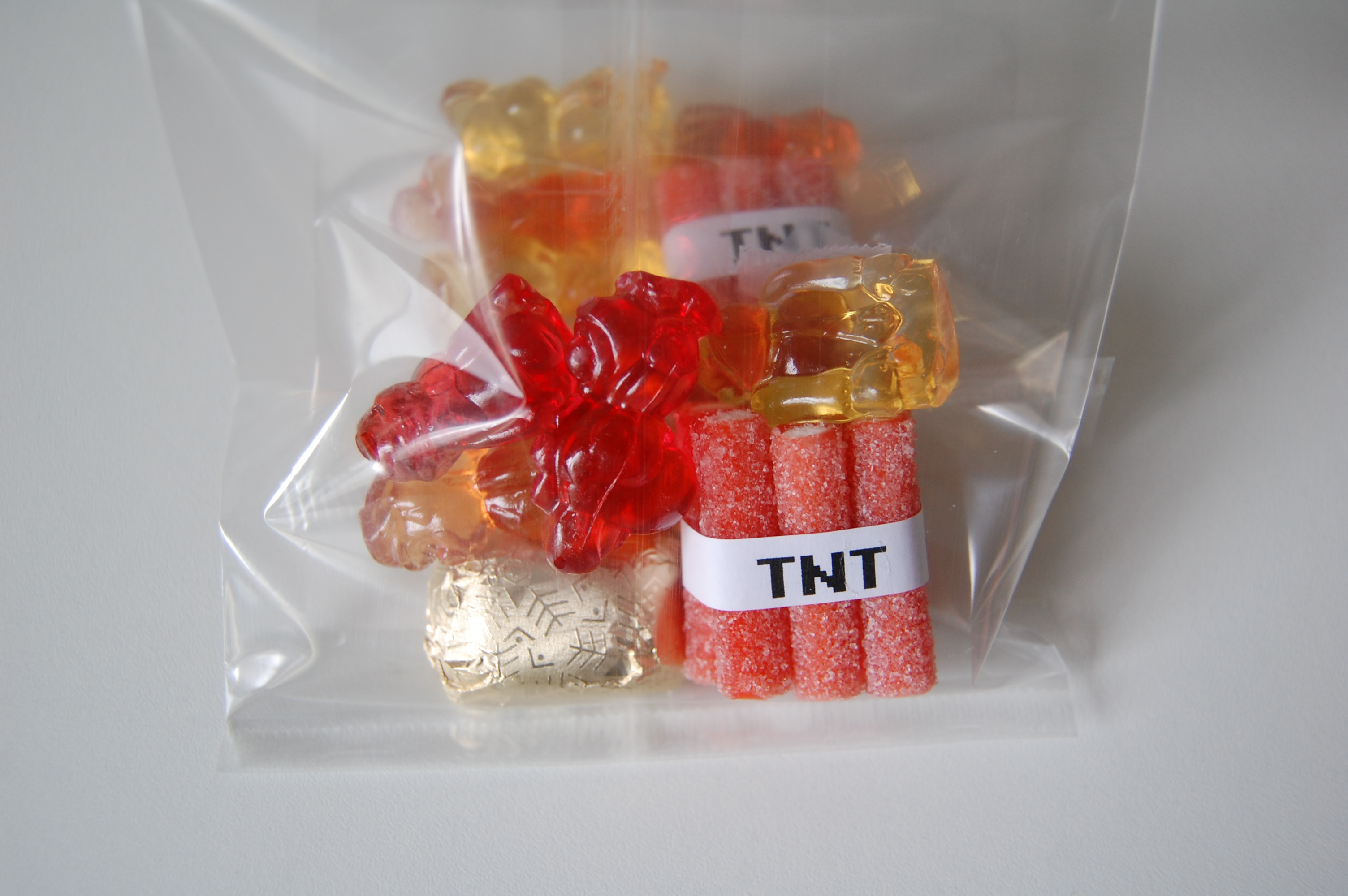 J’avais des bonbons Mario Bros envoyés par Christine du Canada, j’ai aussi acheté quelques chocolats lindt pour faire des lingots, j’ai rajouté tout cela aux blocs de TNT pour faire un petit sachets de bonbons à donner à la fin de l’anniversaire.