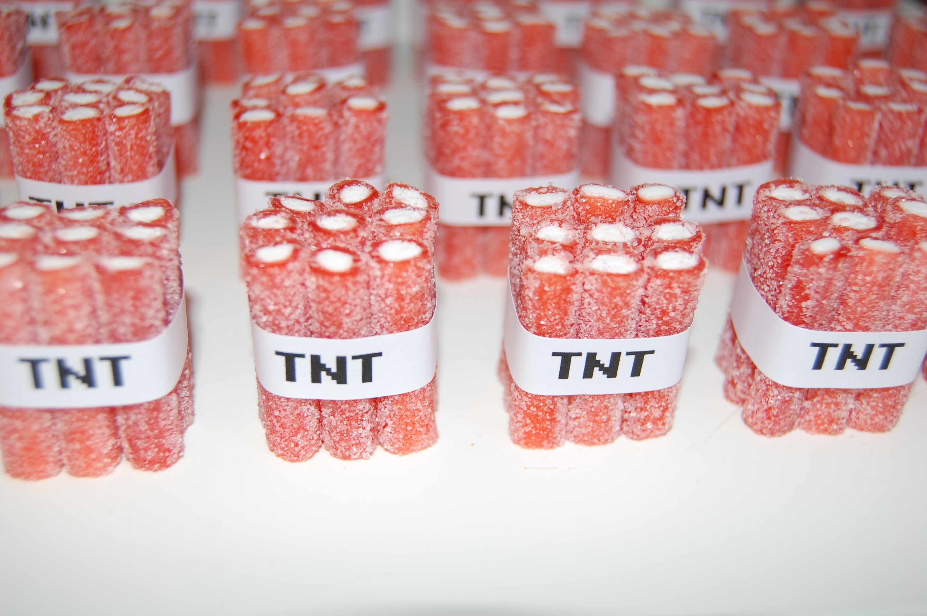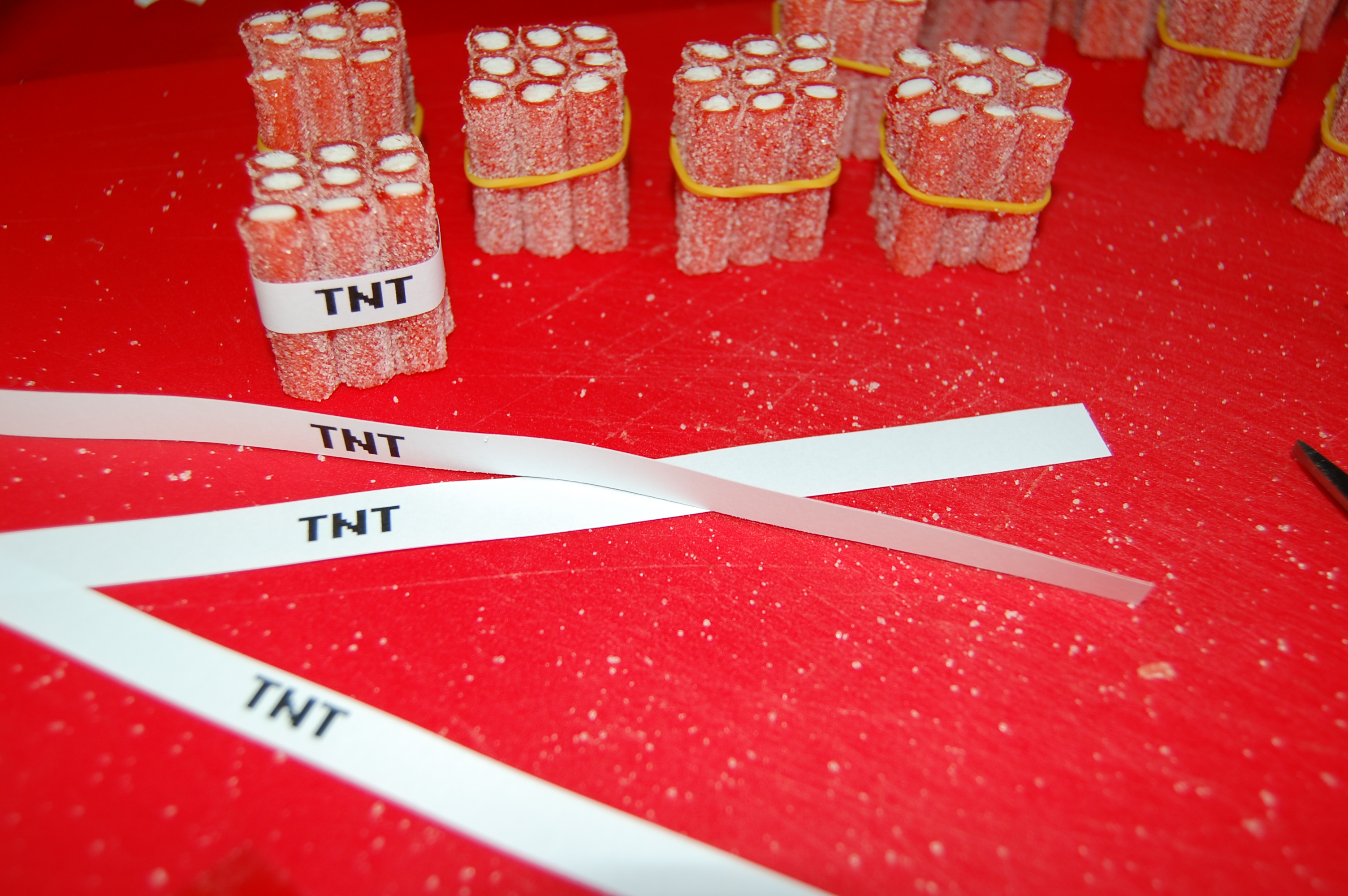 DSC_0235Pour les 11 ans d’Eliot et Samuel, j’ai fabriqué des bonbons-blocs de TNT de Minicraft.