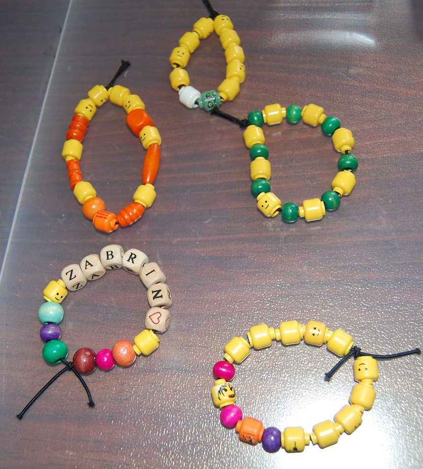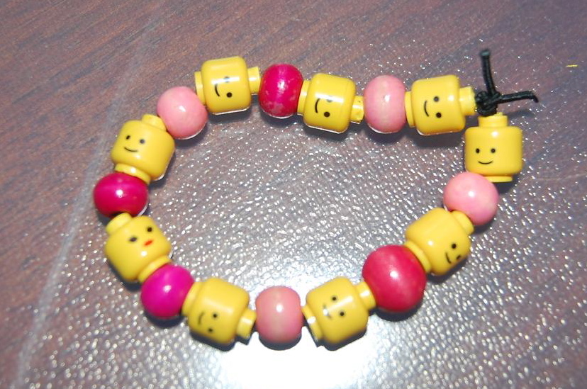 Bon évidemment, il faut des tas de têtes de LEGO : j’en avais trouvé un lot de 500 sur leboncoin, mais on en trouve aussi sur ebay… et après, il faut les percer une par une… mais une fois qu’on a fait tout ça, c’est chouette, parce que ça donne un bricolage super, qui a plu autant aux garçons qu’aux filles, car il y avait des têtes de mort (les garçons ont adoré), et qu’on pouvait aussi rajouter des petites perles (les filles ont adoré) !